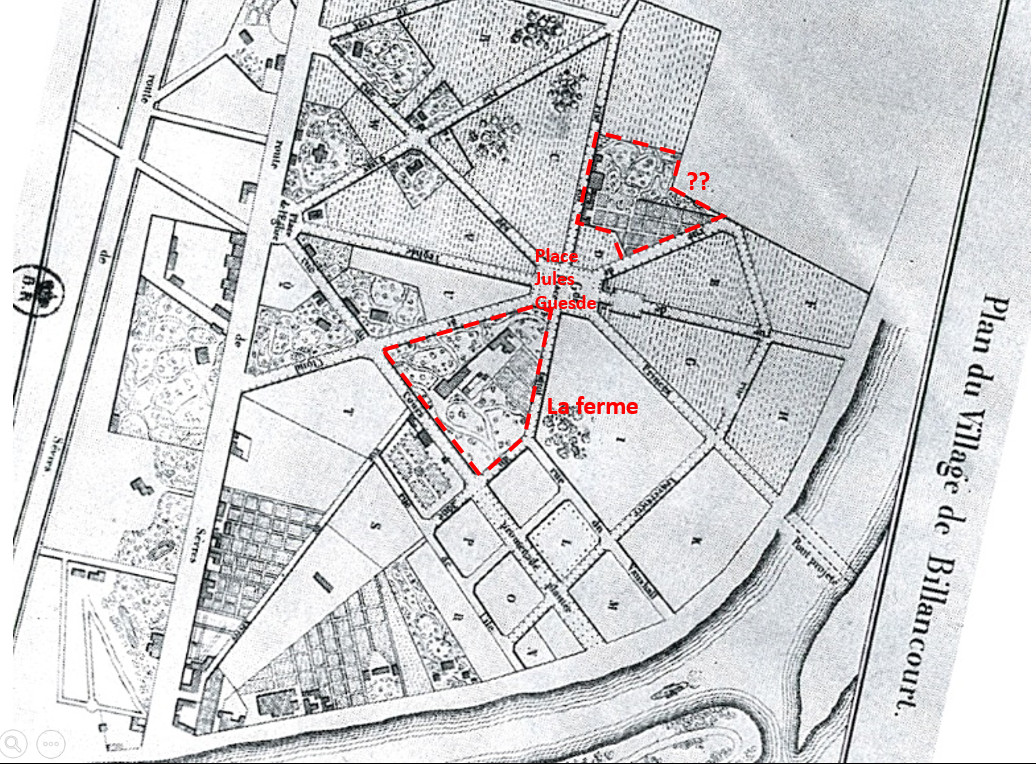 En 1826, il n’y avait pas grand monde à Billancourt. Gourcuff était seul propriétaire de l’immense domaine de la ferme de Billancourt et venait de découper les 70 hectares de terrains pour les proposer à la vente sous le nom de « village de Billancourt ». Huit ans après, sur son plan promotionnel de 1834, on peut voir que le succès n’est pas au rendez-vous. Quelques terrains ont trouvé acquéreur, non loin de la route du Vieux pont-de-Sèvres (« ancienne route de Sèvres », sur le plan). La ferme y est représentée à proximité de ce qui ne s’appelle pas encore Place Jules Guesde. Mais ce qui a attiré notre attention, c’est une grande propriété de l’autre côté de la place, sur l’actuelle rue du Point-du-Jour, au niveau des numéros 117-119.