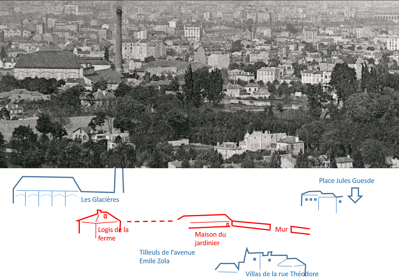 Le bâtiment à gauche est la maison du maître, le logis où habitaient les propriétaires. Le petit bâtiment entre le logis et le muret est décrit en 1770 comme étant un poulailler, puis en 1782 comme la maison du jardinier. On ne peut voir le reste des bâtiments, cachés par les tilleuls de l’avenue du Cours (Emile Zola).