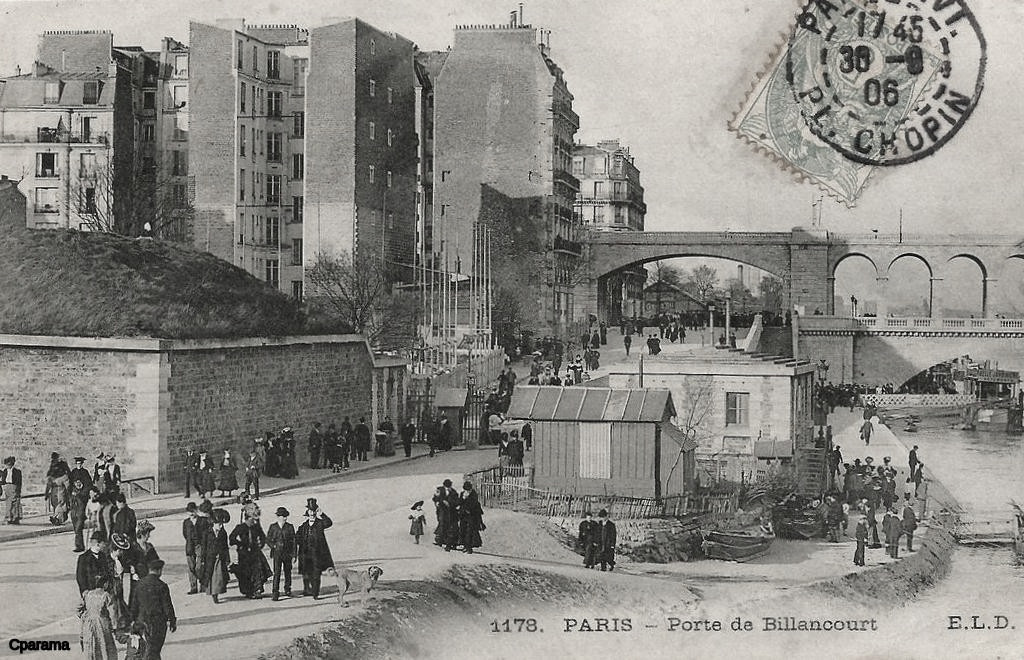 Nous voyons sur cette photo l’ancienne porte de Billancourt, au début du siècle dernier, avec sa grille et son bureau d’octroi. C’était la limite entre Paris et Billancourt. Le pont est l’ancien viaduc d’Auteuil. Vous reconnaissez l’endroit ? Cherchez bien. C’est là où débutent aujourd’hui les voies sur berge. Toujours pas ? Alors comparez par rapport à la photo contemporaine ci-dessous, on reconnait bien l’immeuble haussmannien à gauche. A droite nous reconnaissons la rampe d’accès aux voies sur berge et le pont du Garigliano. Vous y êtes ?