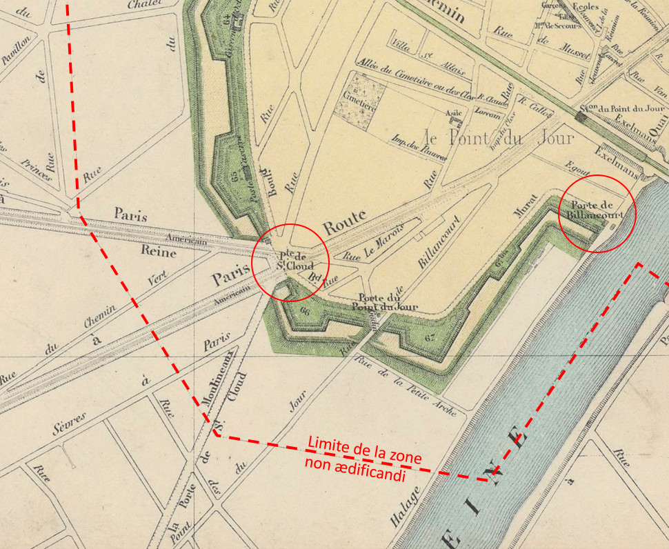 Cette année-là, Adolphe Thiers, président du Conseil, fait construire un réseau de fortifications qui fait le tour de Paris. (On peut voir une extrémité à gauche de la photo). L’enceinte est percée de 17 portes qui donneront leur nom aux portes de Paris actuelles (Porte de Saint-Cloud, Porte d’Auteuil etc…).