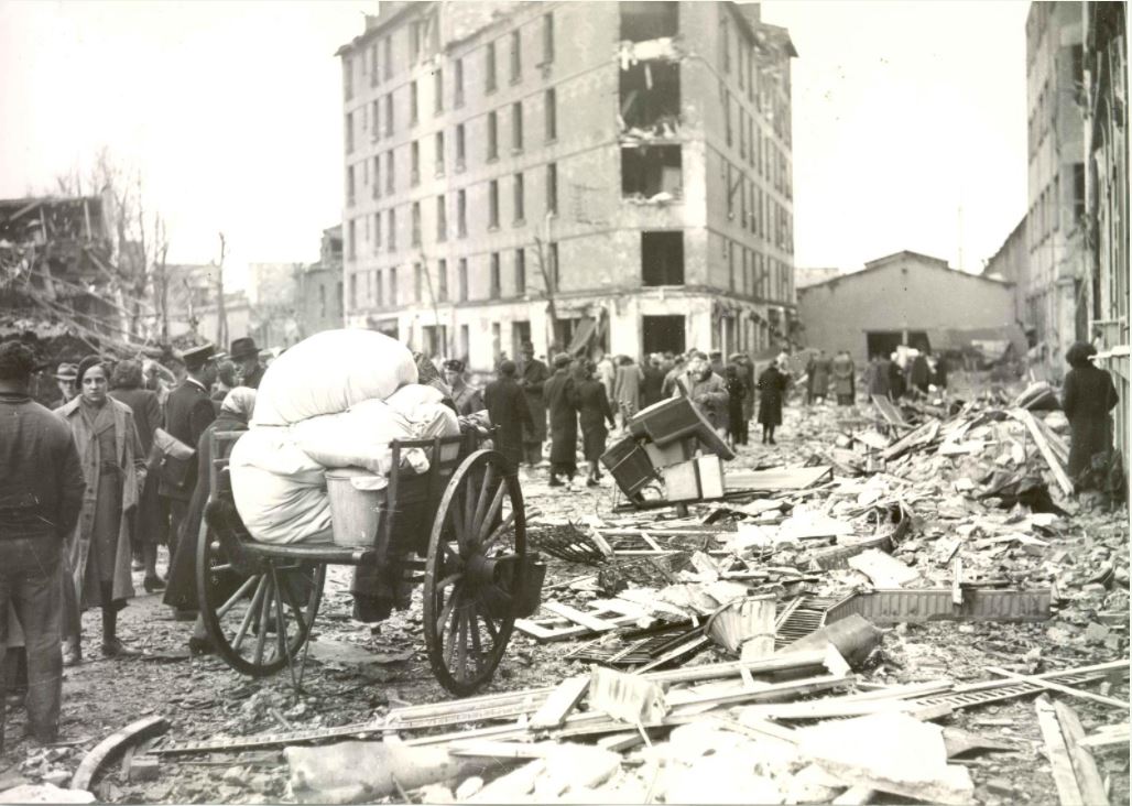 Photo en tête d’article : L’ancien hôpital Ambroise Paré depuis la rue Casteja, au lendemain du bombardement. Archives municipales.