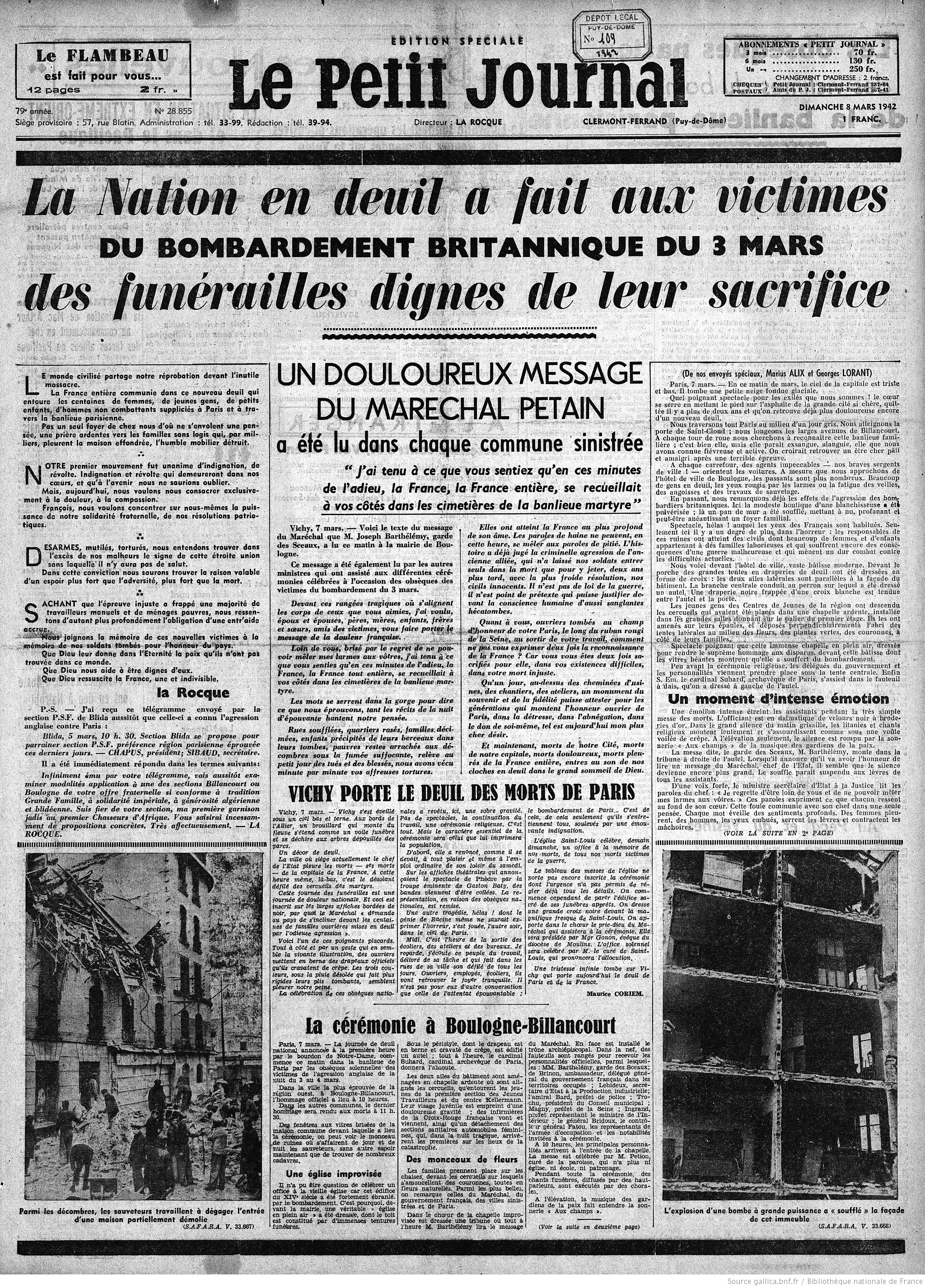 Le 6 mars, les « actualités mondiales », favorables au régime de Vichy, diffusent des images saisissantes. La tragédie « soulève l’indignation générale » souligne le Maréchal Pétain, en dénonçant l’attaque comme une agression envers la nation. A voir sur le site de l’INA: