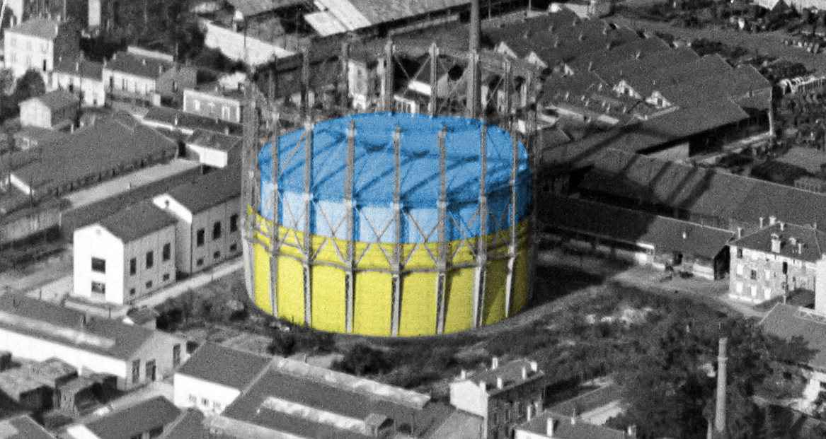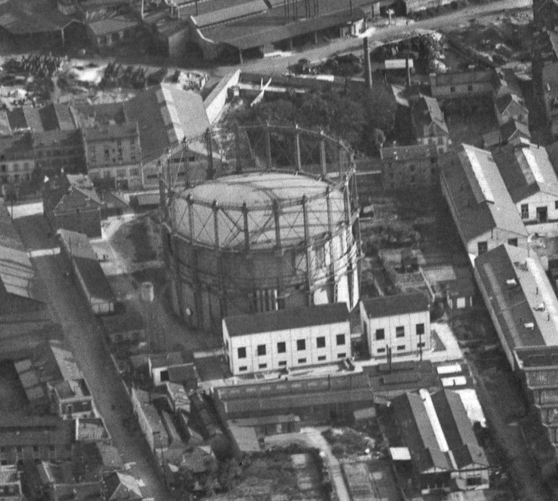 Les photos aériennes indiquent que notre gazomètre comportait au moins 2 levées, ce qui pouvait amener sa hauteur maximale à 40 mètres et sa pleine capacité à 50.000 m3 de gaz de ville. Sur cette photo nous voyons le réservoir d’eau (en jaune) dans lequel les cloches télescopiques sont placées. La première cloche (en bleu) est remplie de gaz. L’autre cloche reste en attente de remplissage dans le réservoir