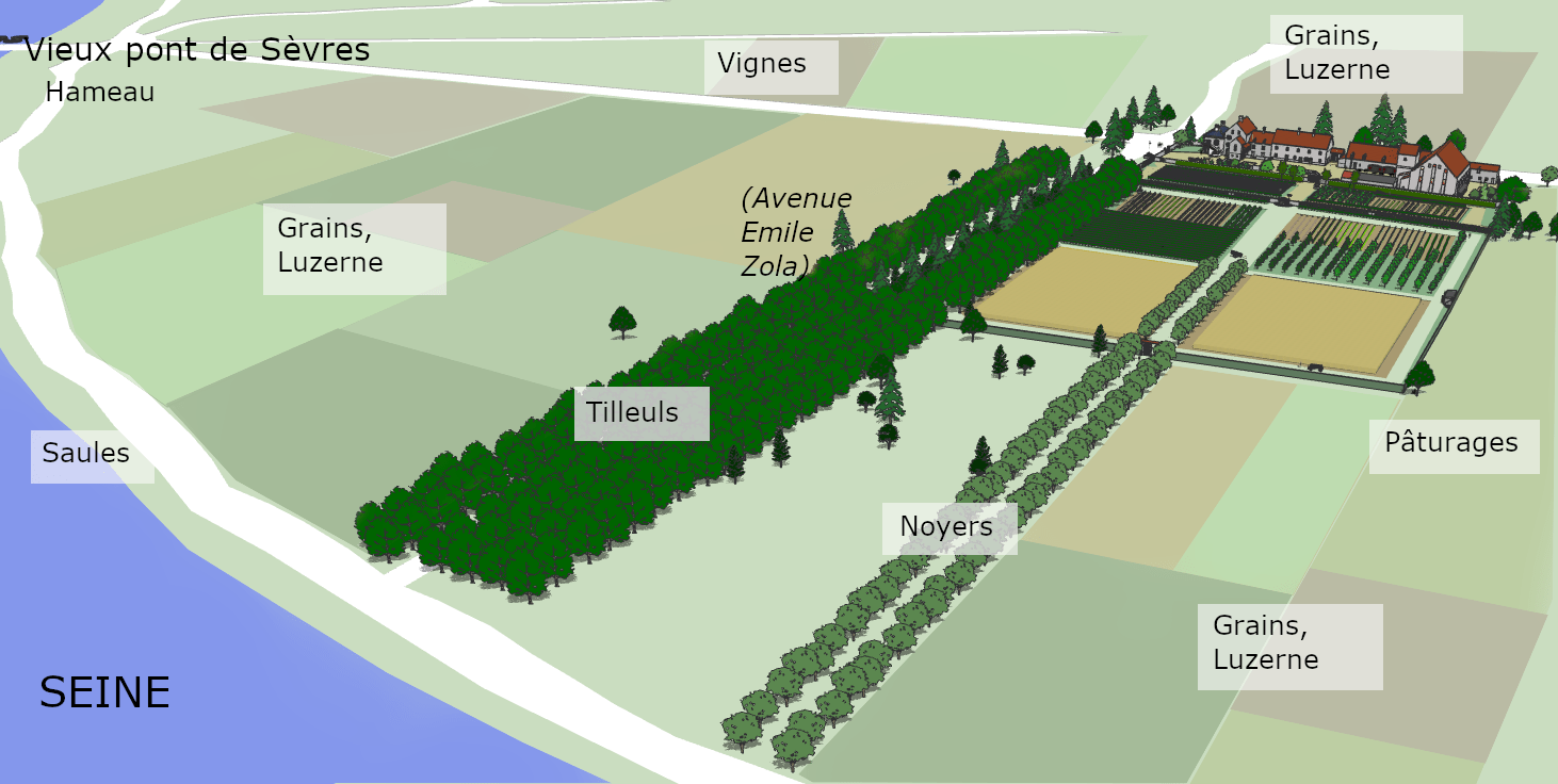 A l’aube de la révolution française, trois comptes-rendus de visite de 1762 à 1782 nous donnent des éléments plus précis. Sur les illustrations qui suivent nous avons localisé les espèces cultivées et les espèces d’arbres sur l’ensemble du domaine. Derrière le mot « grain », il faut entendre blé, avoine ou seigle, les espèces les plus courantes en région parisienne. Pour le fourrage, la luzerne côtoie le sainfoin. On mentionne quelques vignes à l’extérieur et à l’intérieur de l’enceinte de la ferme.