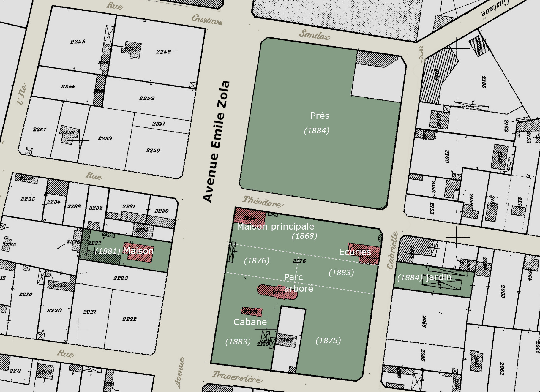 C’est là qu’Alfred et Berthe acquièrent deux terrains contigus de 1.300 m², avec une maison, à l’angle de la rue du Cours (avenue Emile Zola) et de la rue Théodore (disparue), auprès de deux parisiens, Michel Motheau et Victor Paul Delacroix.