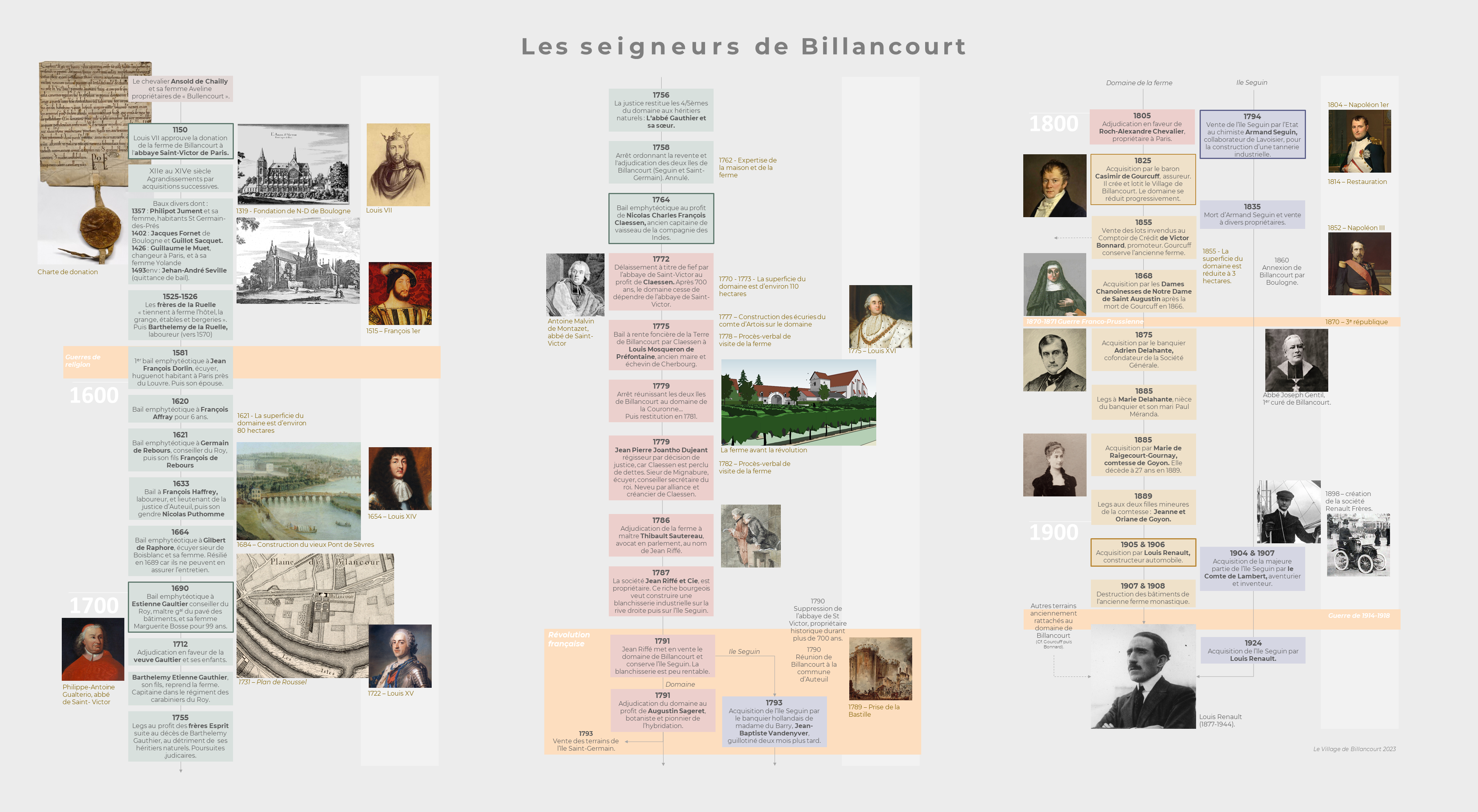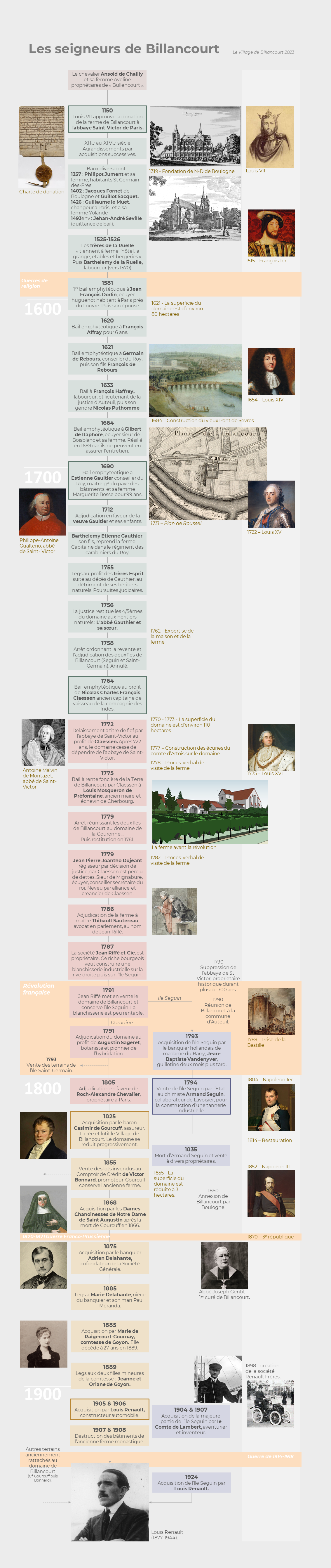 Cette « cartographie des seigneurs de Billancourt » vous propose, d’embrasser en un seul regard, les presque huit siècles d’histoire du domaine de la ferme de Billancourt, depuis Ansold de Chailly à Louis Renault, de 1050 à 1924, de la rive de Billancourt à l’Ile Seguin.