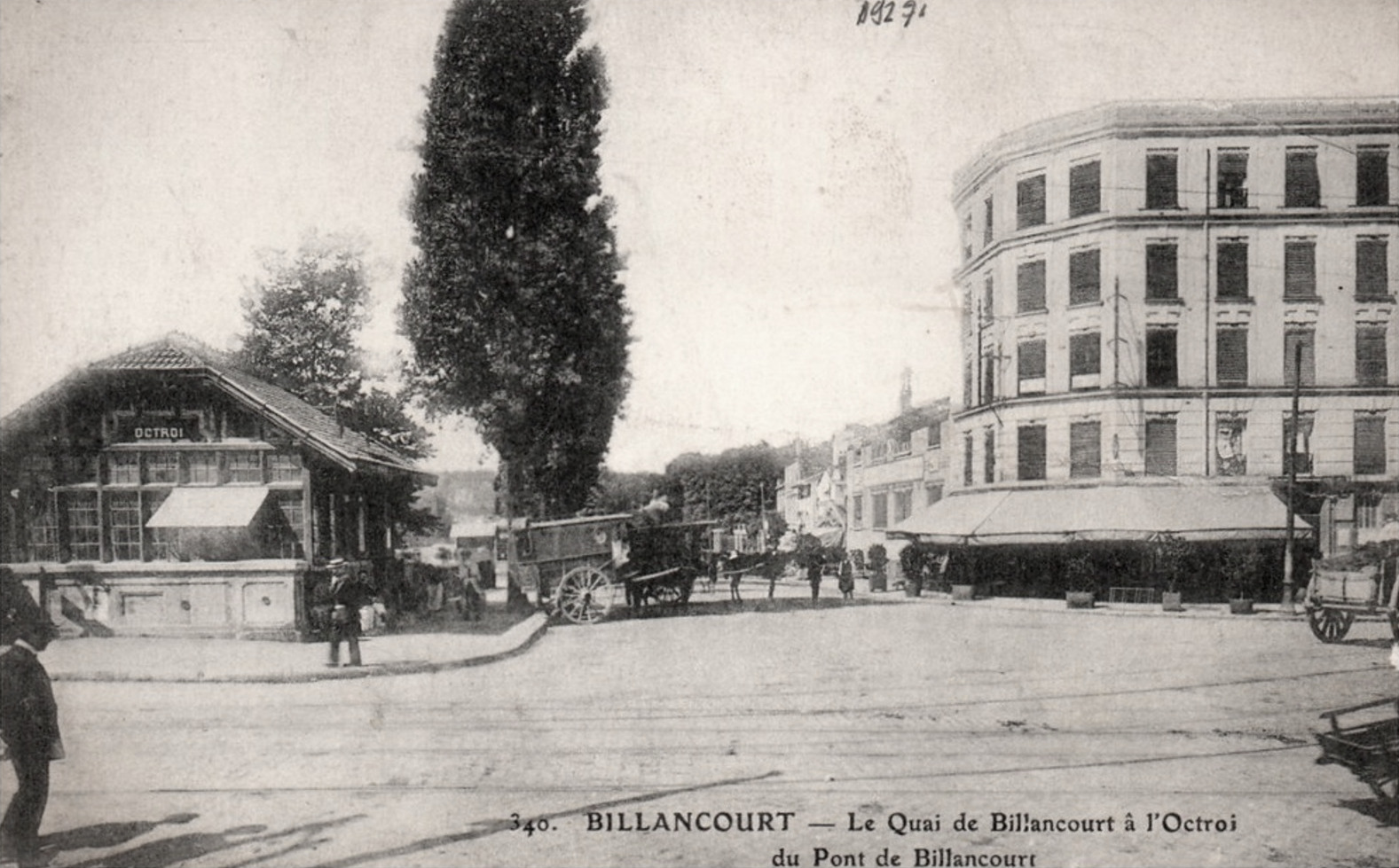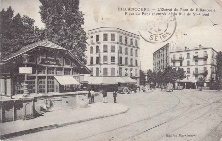 Un premier octroi était situé au pont de Billancourt. Établi vers 1862, en même temps que le pont, il est fait de bois et de briques. C’est certainement le plus pittoresque (voir aussi la photo principale) :