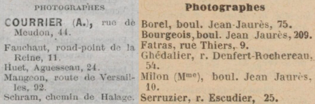 En l’espace de plusieurs mois, nous avons collecté des portraits-carte de Georges Borel, au 75 boulevard de Strasbourg (Jean-Jaurès), d’Eugène Huet au 24 rue d’Aguesseau puis au 25 rue Escudier, de Paul Séruzier, son successeur, rue Escudier, d’A. Courrier, au 44 puis 9 rue de Meudon ou de Frédéric Zinck, au 12 rue du Dôme puis 46 avenue des Moulineaux (Pierre Grenier). Mais on trouve également des clichés d’une « usine photographique » Klerjot, rue du Chemin Vert, Charles Mangeot, route de Versailles, Edmond Darde, route de la Reine ou Fauchat au rond-point de la Reine.