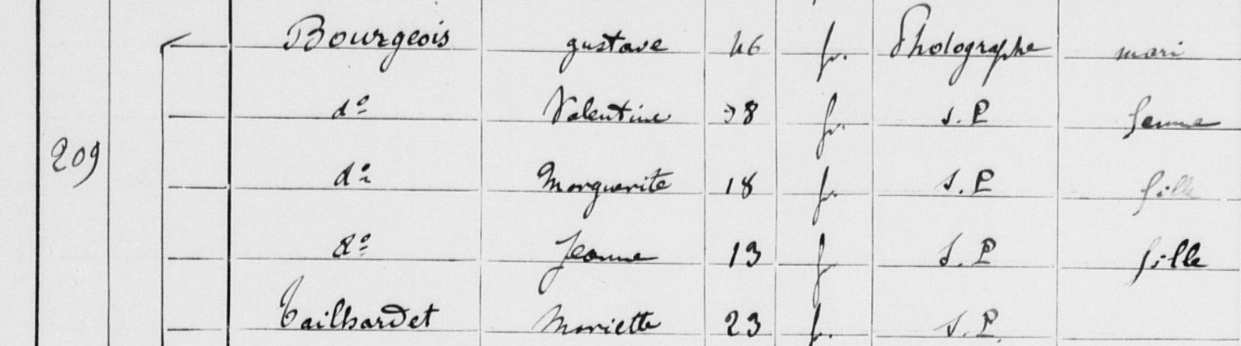 Si nous avons trouvé quelques informations sur Huet, Séruzier ou Borel, nous avons bien peu de choses sur Gustave Bourgeois et, ironie, nous n’avons même pas sa photo ! Né en 1849 à Paris, il est employé de commerce lorsqu’il se marie en 1876 avec Valentine Dupuis. Il arrive à Boulogne vers 1887. Grâce aux recensements nous savons qu’il habite au-dessus de son studio avec Valentine et leurs filles Marguerite et Jeanne. A la fin de sa vie, on y trouve également une domestique: Juliette Milloux.