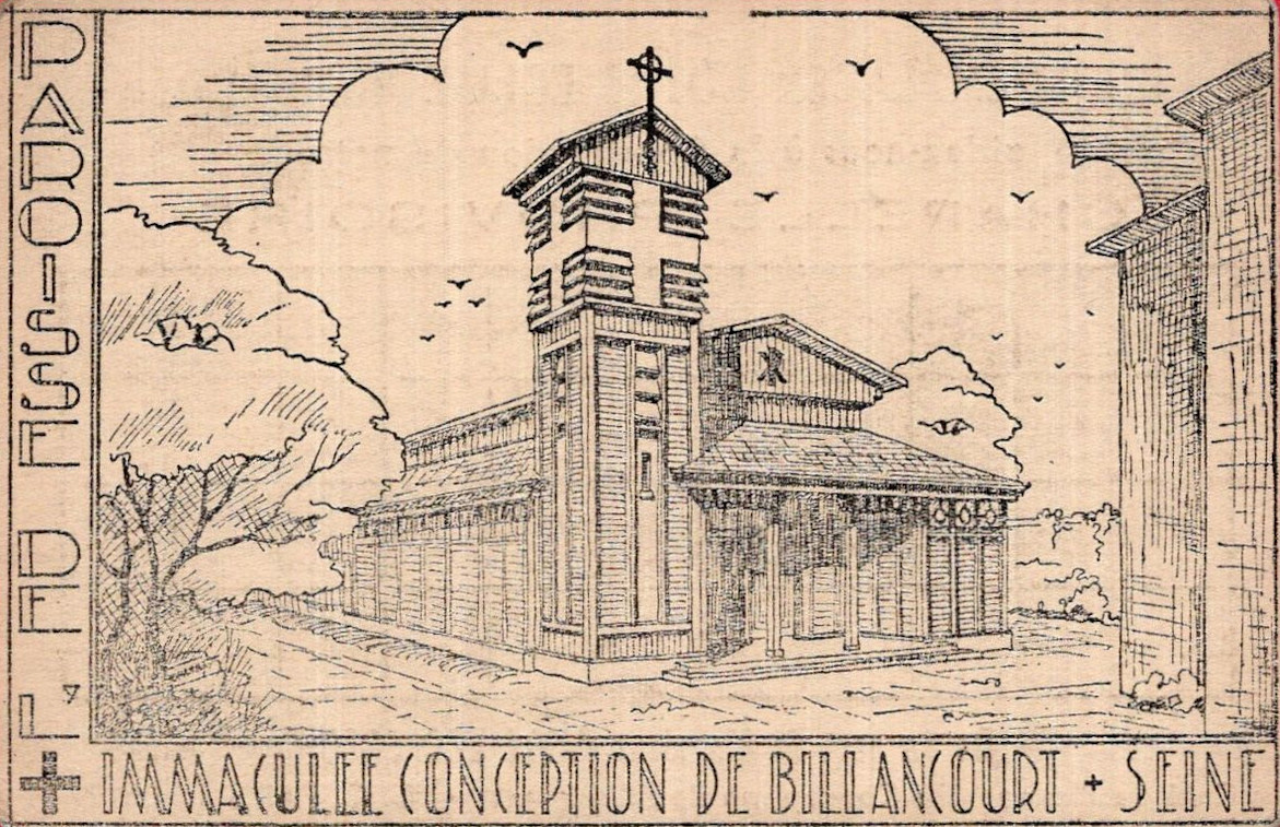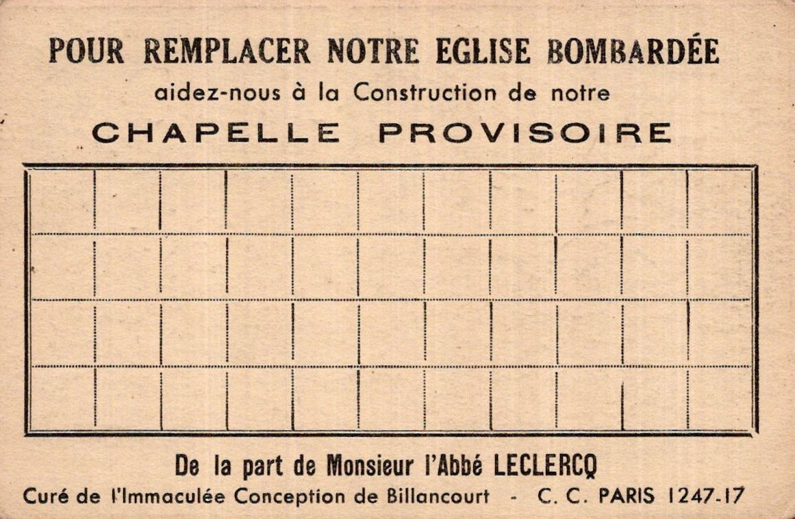 La construction de l’église provisoire au 223 boulevard Jean-Jaurès est portée par l’abbé Leclercq, nouveau curé de Billancourt depuis 1946. Elle est attribuée par l’Etat au titre des « Constructions provisoires ». La municipalité contribue au financement en versant la valeur vénale du terrain nu de l’ancienne église, plus les indemnités reçues au titre des dommages de guerre.