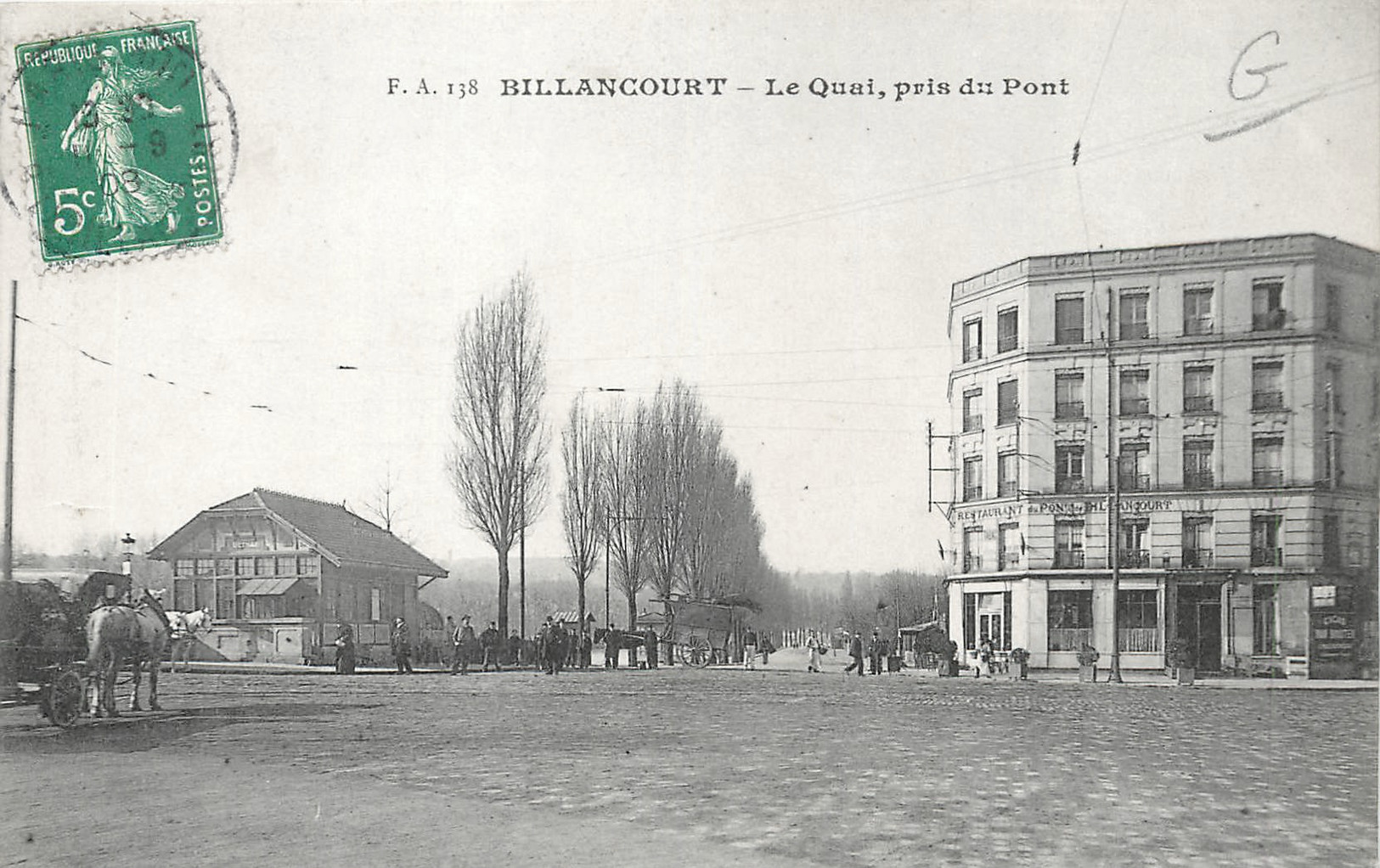 Commençons de l’autre côté de la rue de Saint Cloud (Yves Kermen), à l’angle des quais. S’y est installé un autre restaurant dont on trouve la trace sous le nom « Le vélocipède », dès 1898 dans le bulletin officiel de l’Union Vélocipédique de France. Sur les cartes postales du début du XXe siècle il prend le nom de « Restaurant du Pont de Billancourt ».