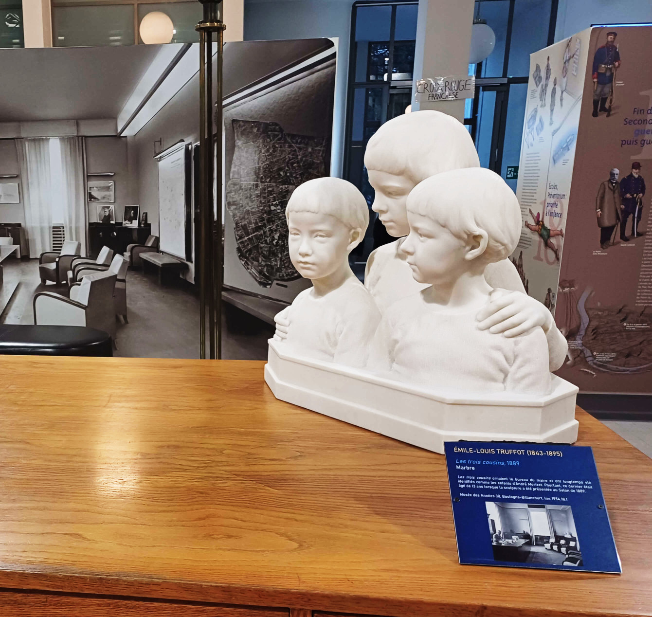 Au beau milieu trône une maquette du quartier à l’époque de la construction de l’hôtel de ville, une reconstitution du bureau de Morizet avec son mobilier et un beau groupe de bustes. Partout des photos d’archive, des documents, des panneaux et des reconstitutions de belle qualité.