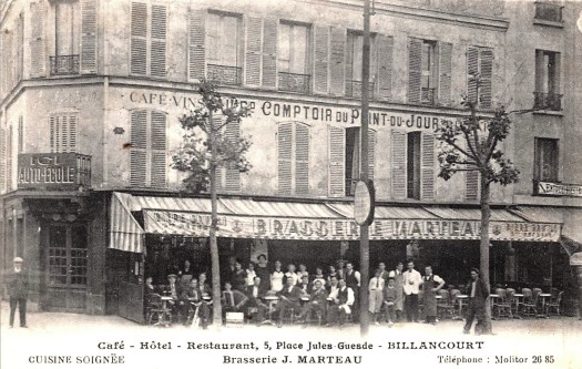 Dans les années 30, on trouve le nom de « Jules Marcon » dans les recensements et sur la devanture . Puis le café-restaurant devient la « Brasserie Marteau« , du nom de son patron : Pierre Marteau. À l’époque, la place Nationale est très fréquentée, surtout à l’heure de sortie des usines, car Renault est devenu un géant qui emploie 30 000 à 40 000 ouvriers. La brasserie est témoin des tensions sociales, occupations, et manifestations des années 30, après l’arrivée du Front Populaire. Dans les étages de l’hôtel meublé vivent des ouvriers: mécaniciens, ajusteurs, tourneurs ou employés, beaucoup travaillent chez Renault.