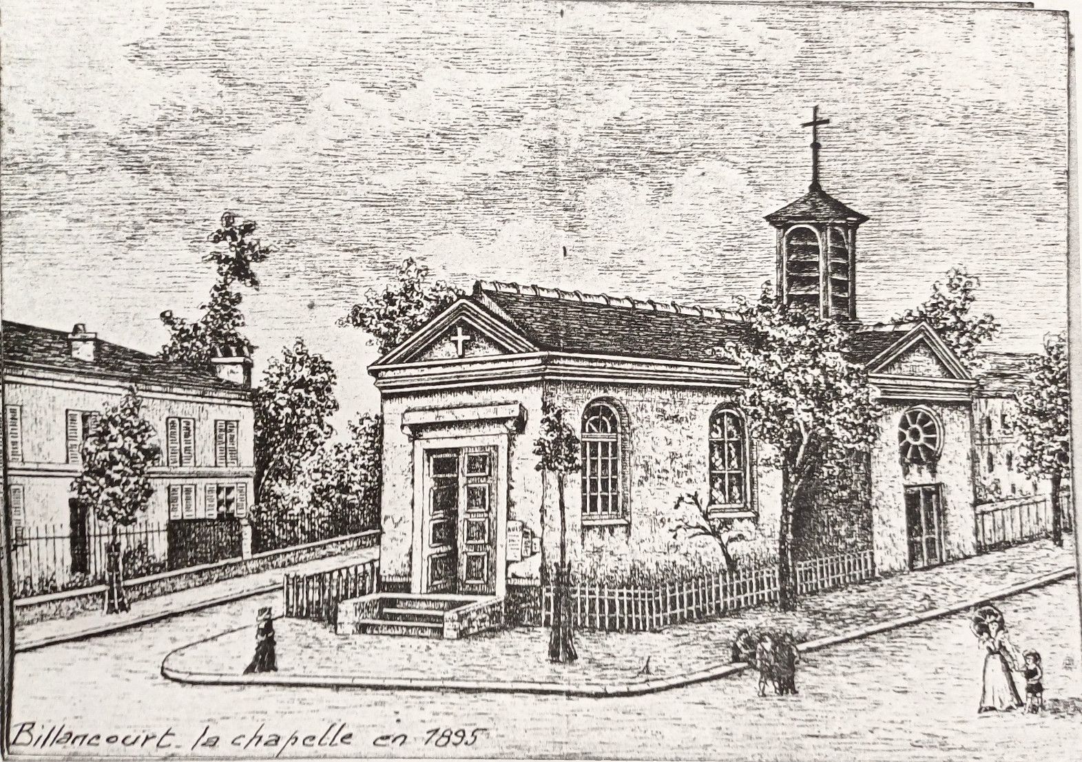 La première église de Billancourt n’est qu’une petite chapelle bâtie en 1834 par le comte de Gourcuff, créateur du Nouveau Village de Billancourt, sur ce qui est aujourd’hui la place Bir-Hakeim. À l’époque Billancourt ne comporte que quelques centaines d’habitants et essentiellement des résidences secondaires. Billancourt est érigée en Paroisse en 1860, lors de l’unification de Boulogne et Billancourt. Ses limites vont jusqu’à la rue Gallieni actuelle, pour une population de 1 800 âmes. Son premier curé est l’énergique abbé Gentil. Malgré plusieurs agrandissements, elle peine à accueillir tous ses paroissiens chaque dimanche.
