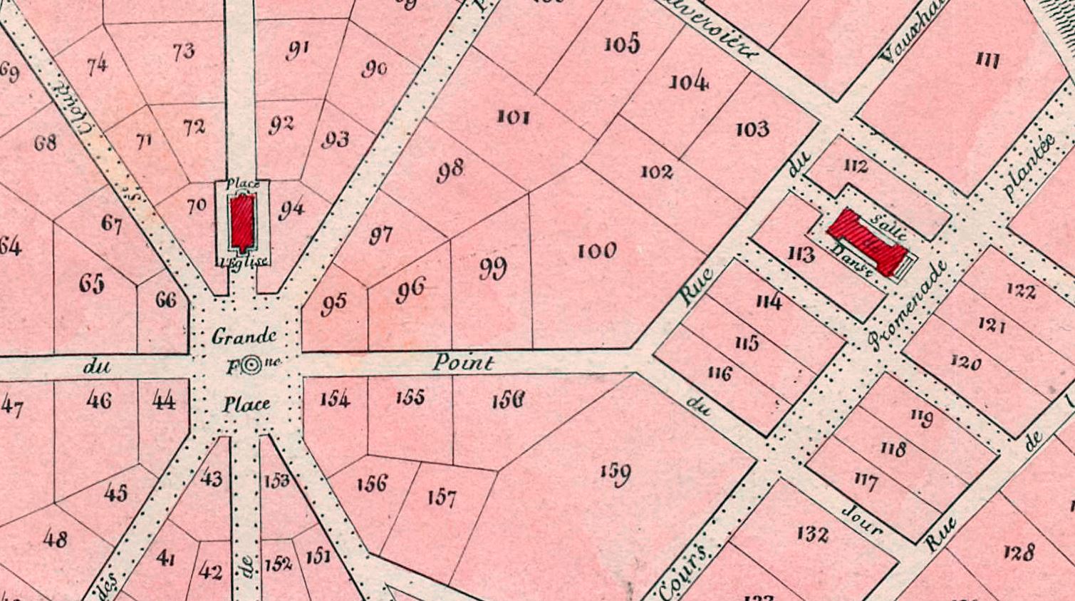 En rouge, figure un projet d’église, au beau milieu de la rue Nationale. À droite, on découvre un projet de salle de danse (appelée également « vauxhall »2). Ces deux projets ne verront jamais le jour: