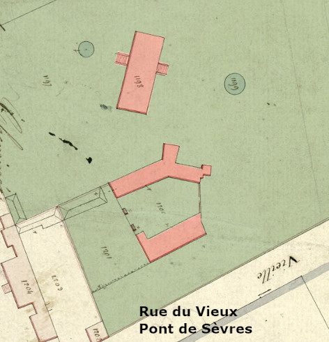 Voyez cette vue de Carle Vernet depuis Brimborion, vers 1810, qui montre le quartier du pont de Sèvres. Dans le cercle, l’emplacement approximatif de la propriété, au bord de cette rue du vieux pont de Sèvres qui conduisait alors au pont de bois de Louis XIV.