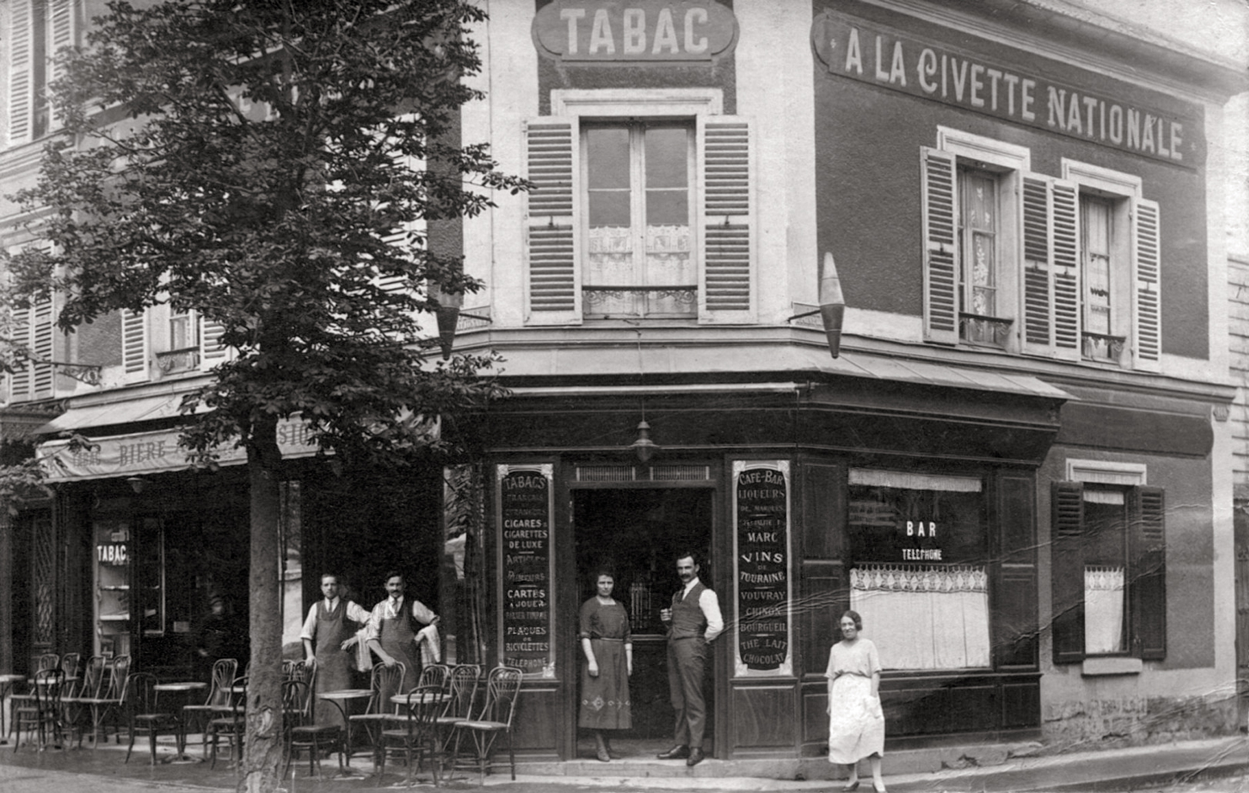 Dans les années 1920, le commerce passe entre les mains de Gustave Tessier et son épouse Adolphine. L’épicerie devient un bar-tabac rebaptisé « A la Civette Nationale« . Le coin épicerie a disparu et cède la place à un vrai restaurant. On y sert des vins de Touraine : Vouvray, Chinon ou Bourgueuil. Le premier étage est occupé par un billard où viennent jouer les cols blancs de Renault. L’usine emploie plus de 10.000 employés.